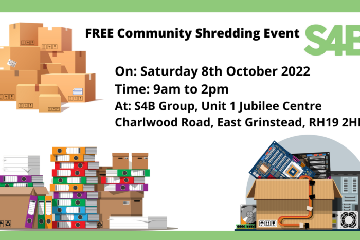 How do you get involved? Head across to our S4B Premises on Charlwoods Road, RH19 2HL East Grinstead between 9am to 2pm on Saturday 8th October 2022 where the team at S4B will take your items for shredding and shred them securely there and then on-site for you. There is no cost for this special one-off service, so make the most of the opportunity to have a good old clear out and rid yourself or your business of out-of-date paperwork, old utility bills, waste paper, old invoices and other paper clutter.